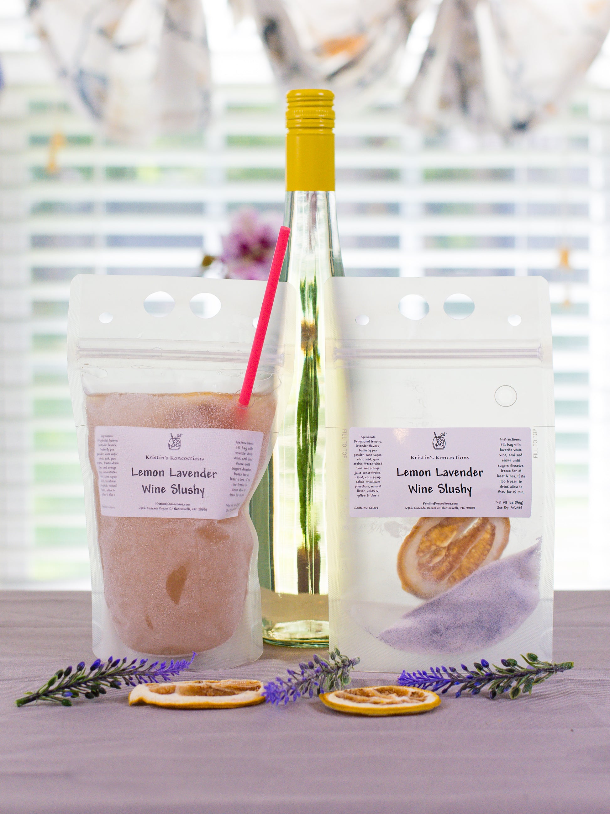 - Lemon Lavender - Lemons, lavender and butterfly pea powder - goes well with white wine.